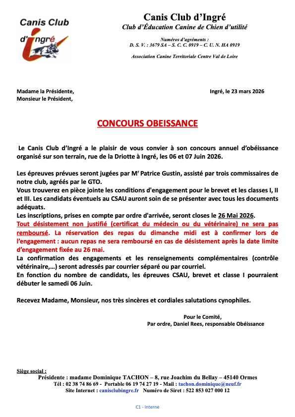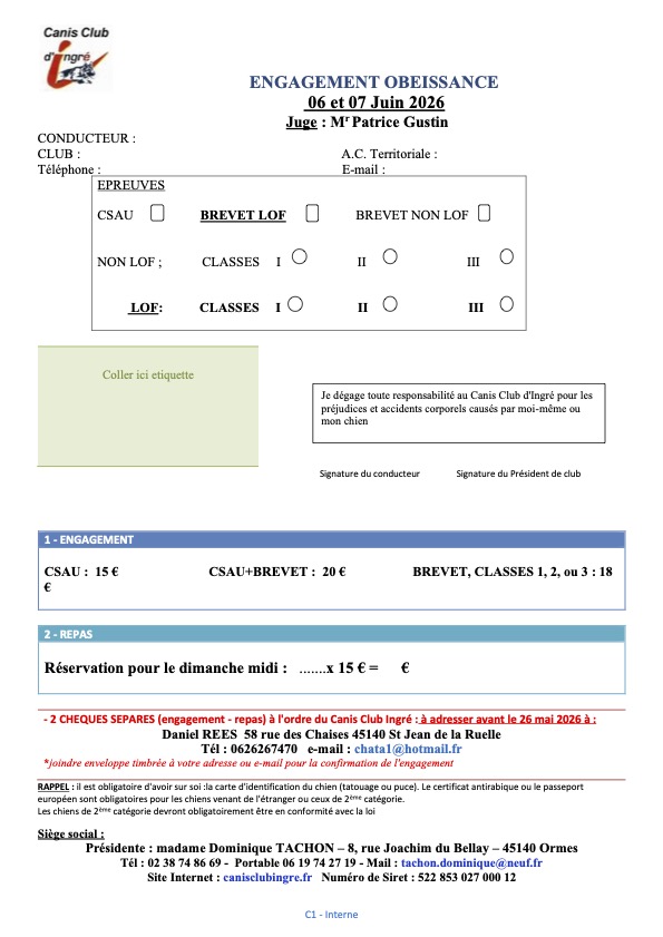 Pour vous inscrire au concours d'obéissance des 6 et 7 juin